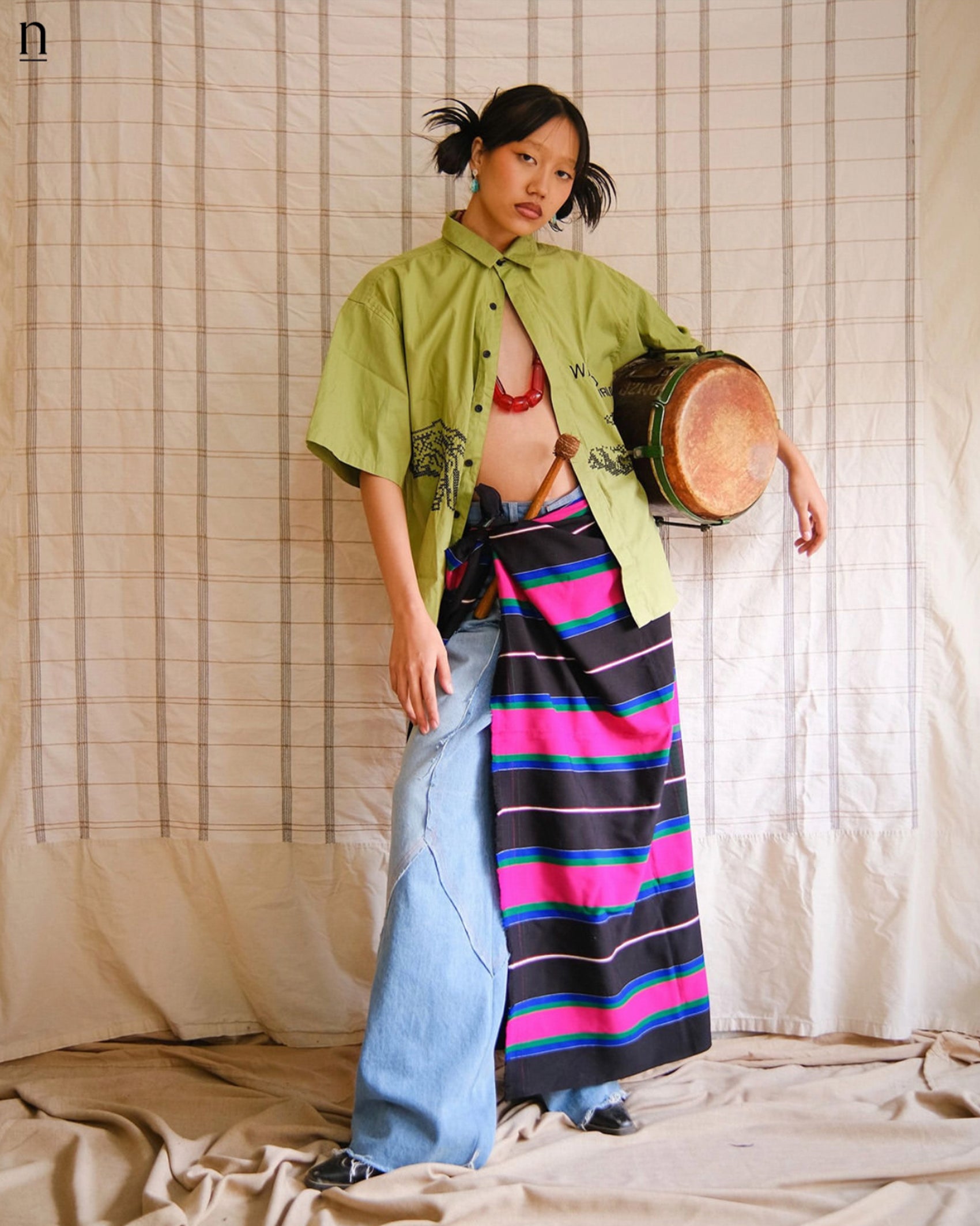 a full denim skirt look that felt bold, effortless, and completely his.Raw energy, sharp movement, and a fit that carried the weight of the stage without losing its ease.A look built for sound, sweat, and presence.
