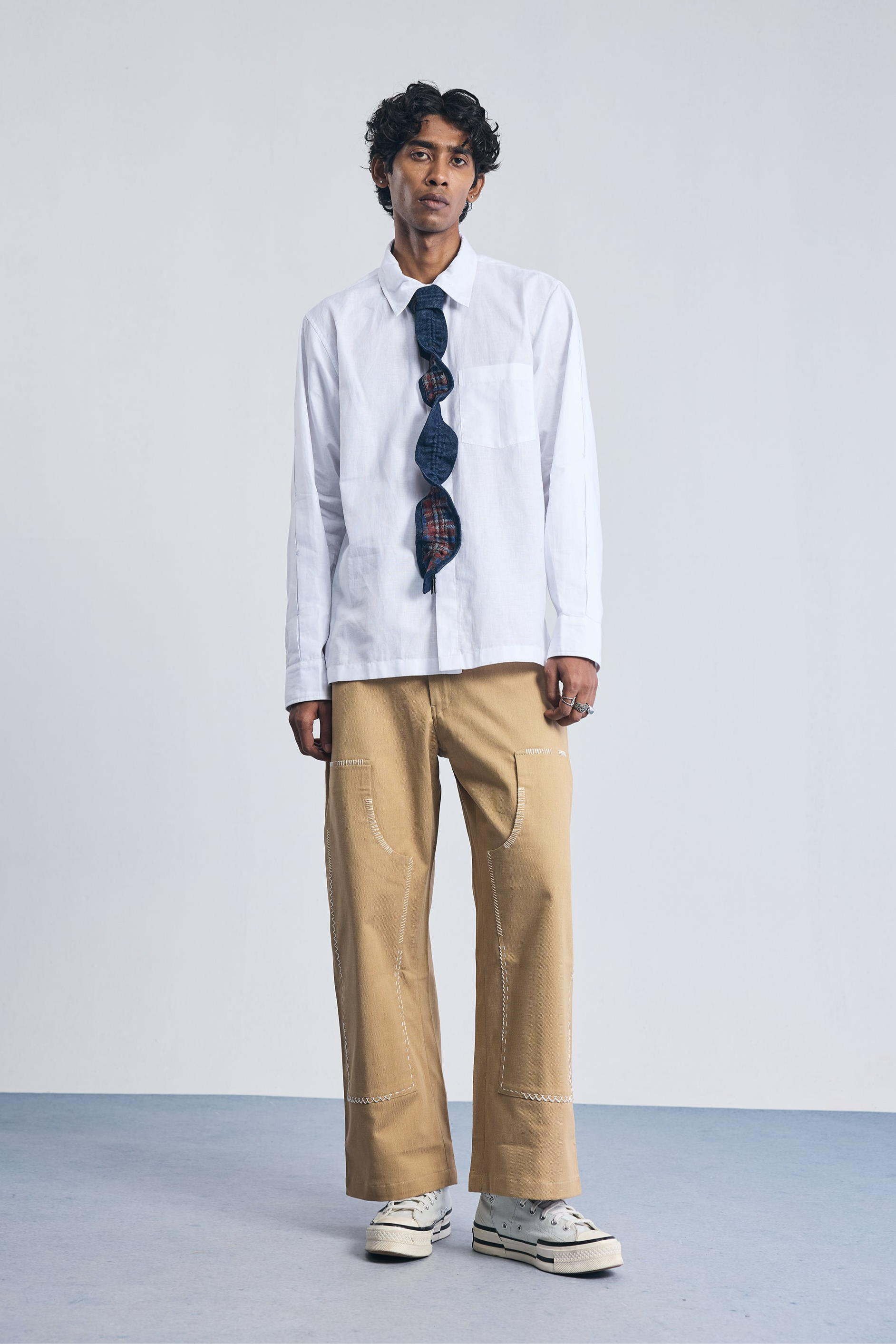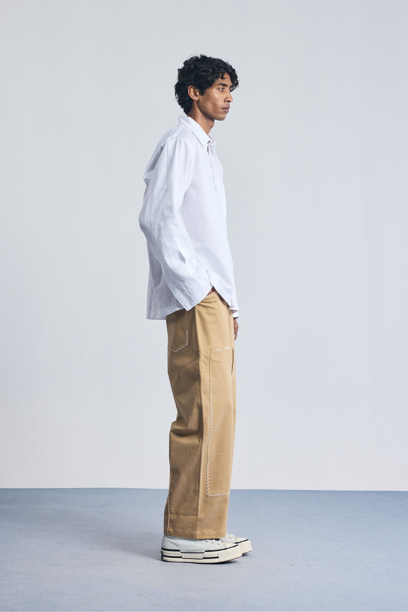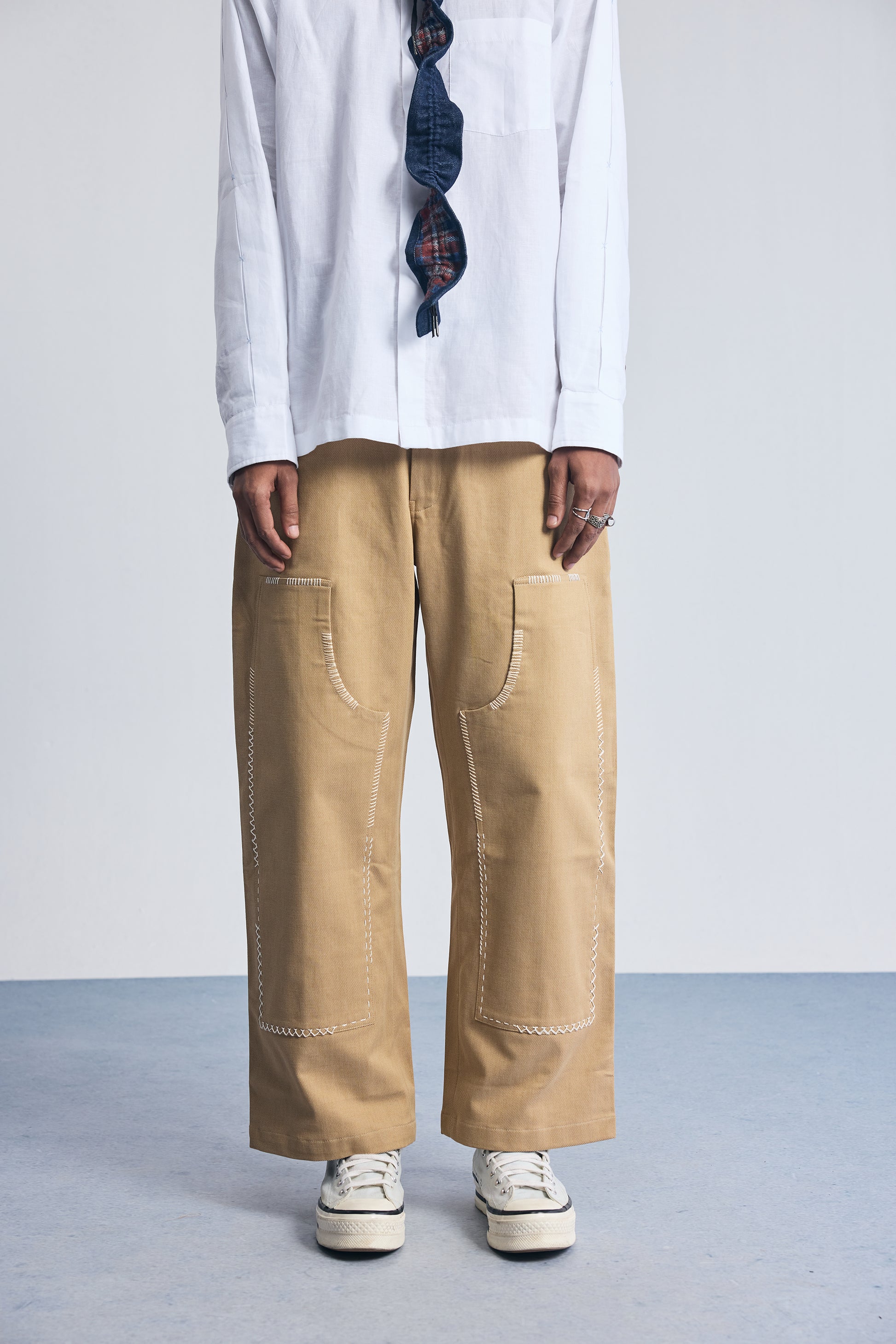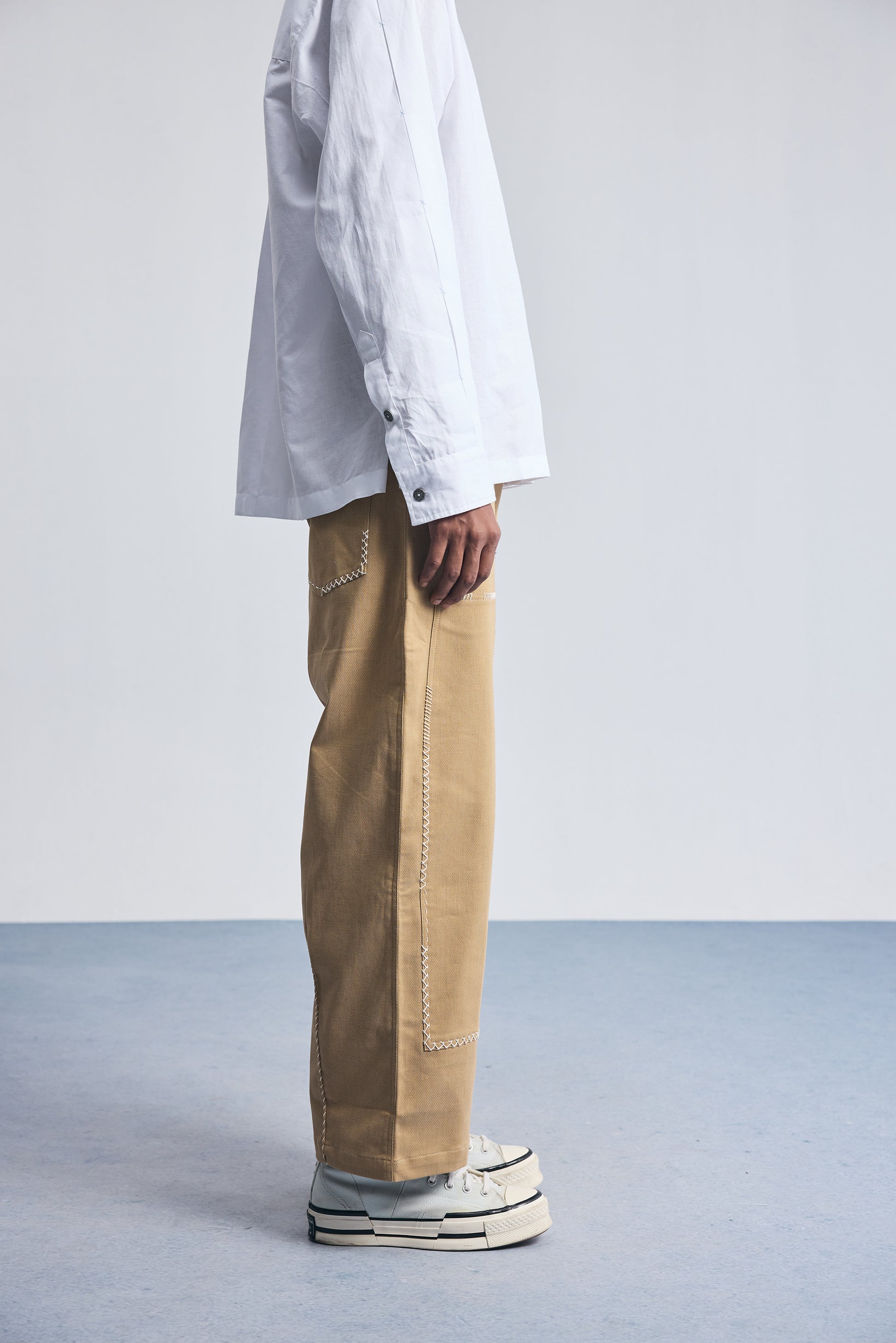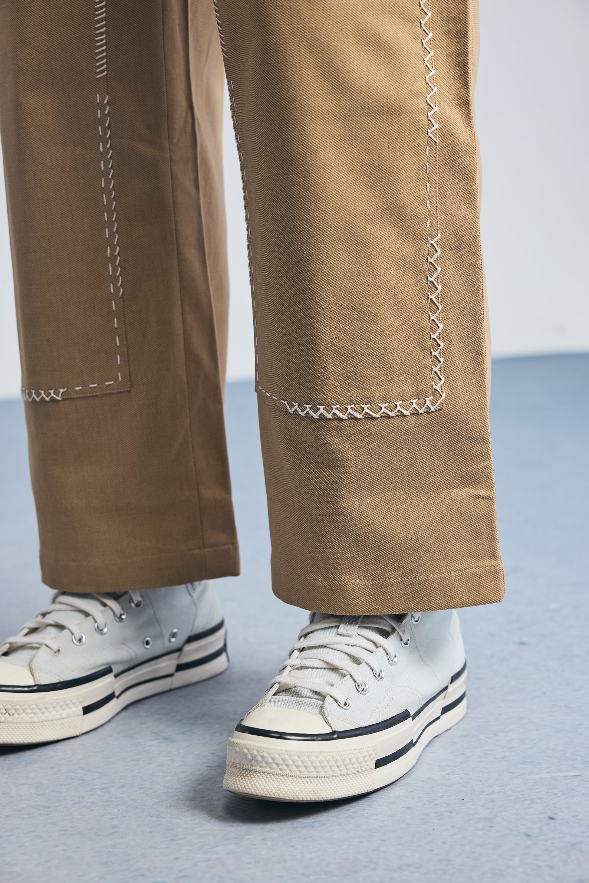 The Compounder Denims are built for function and ease. Inspired by everyday workwear, they feature a straight fit with a semi-horseshoe cut for added comfort. Reinforced at the knees and detailed with hand embroidery that mimics signs of repair — they nod to garments made to last and worn often.