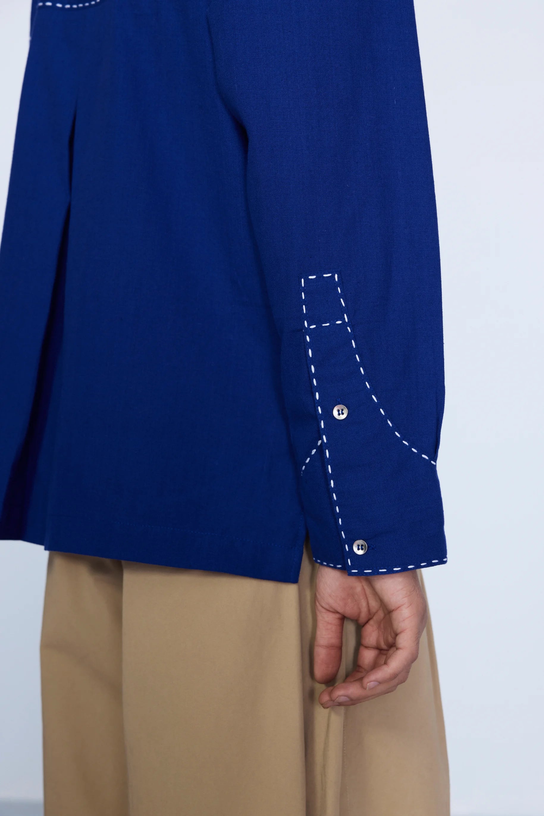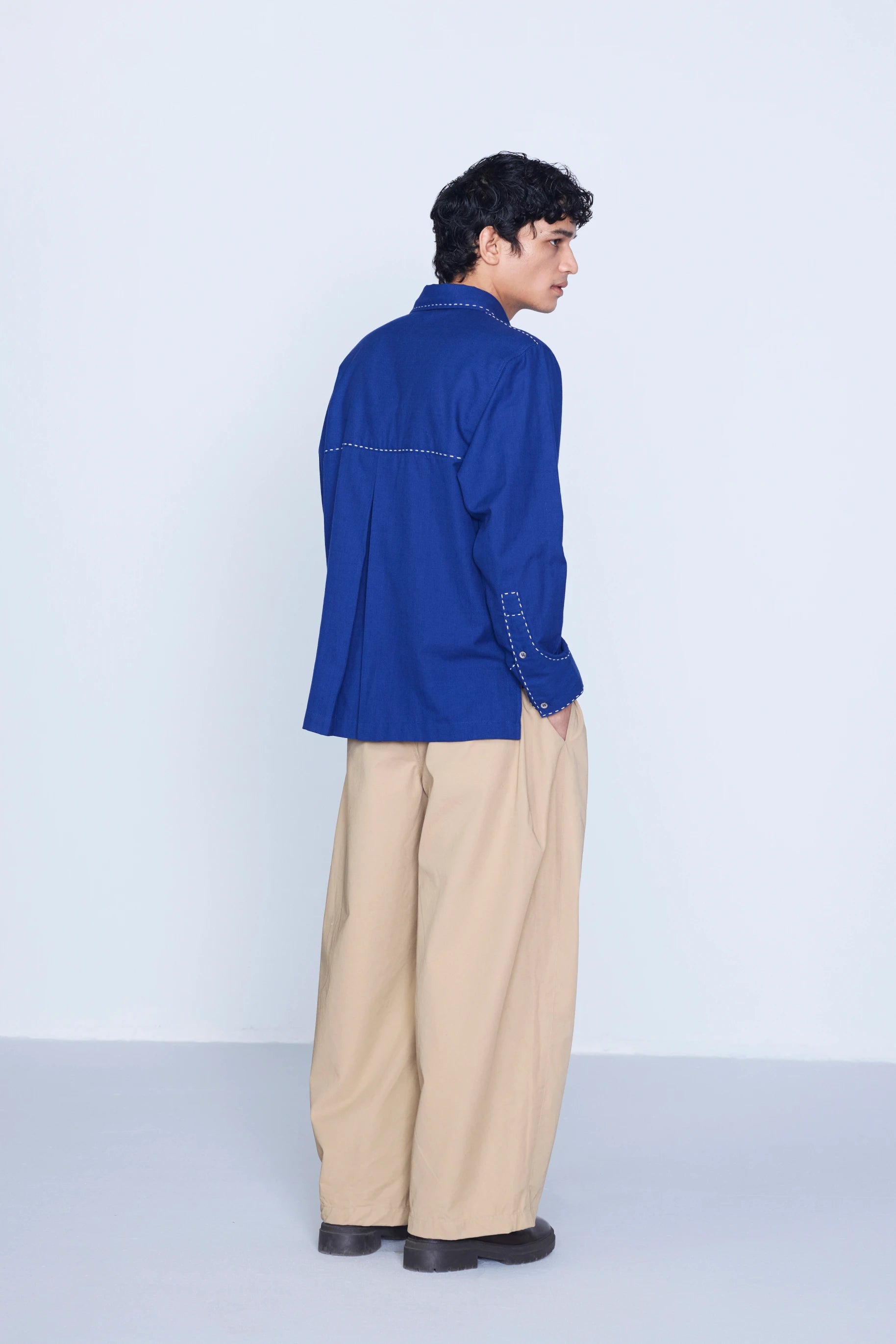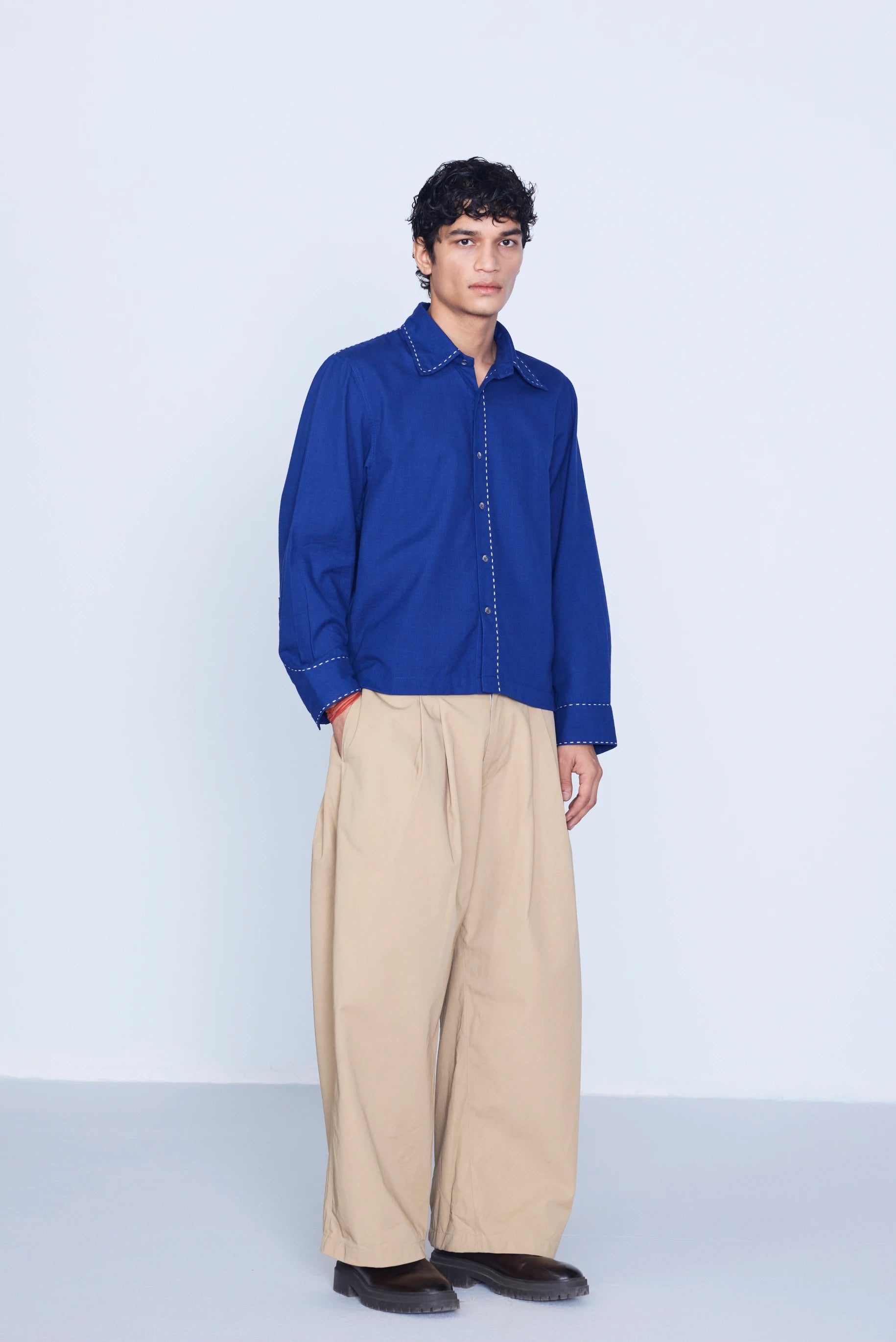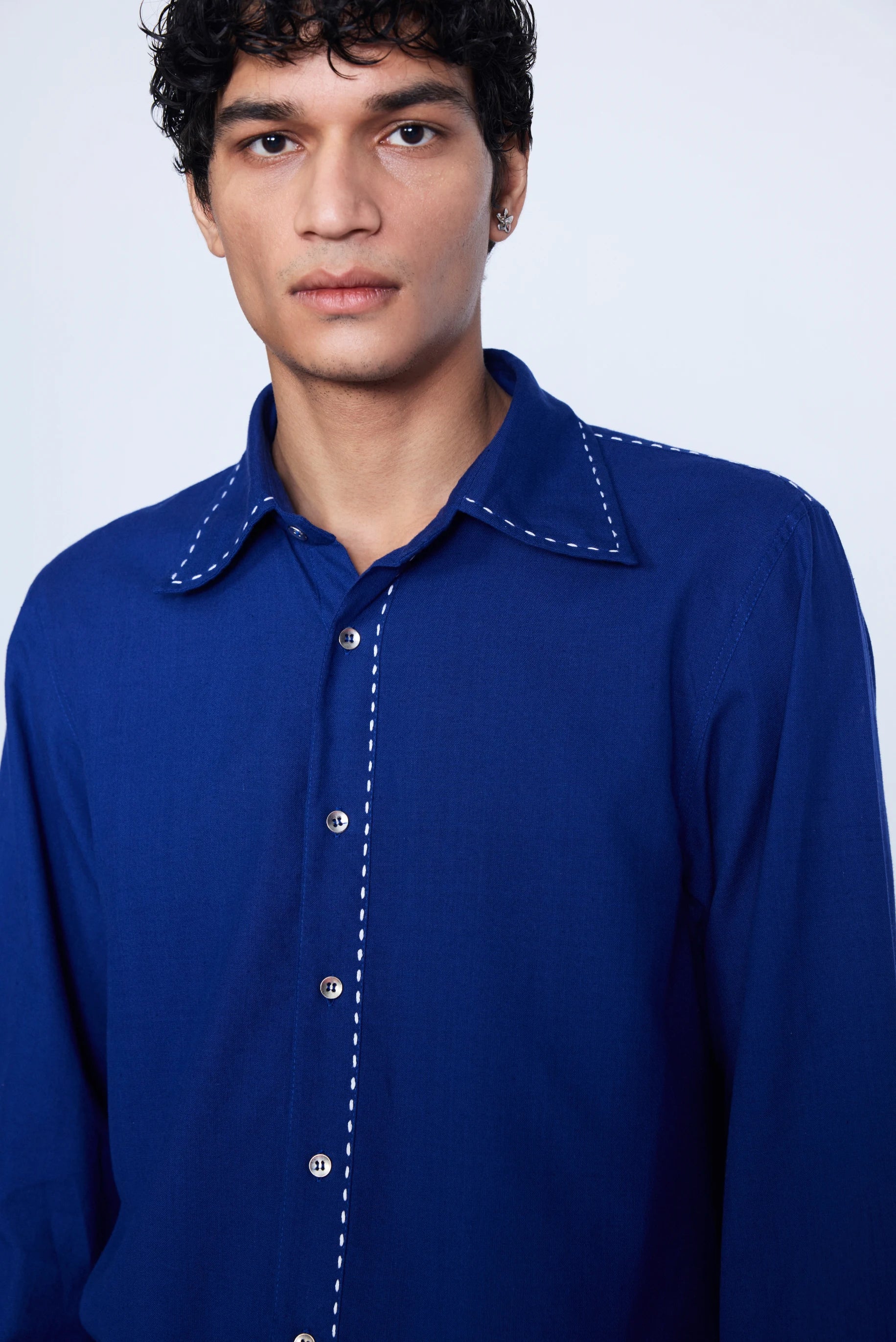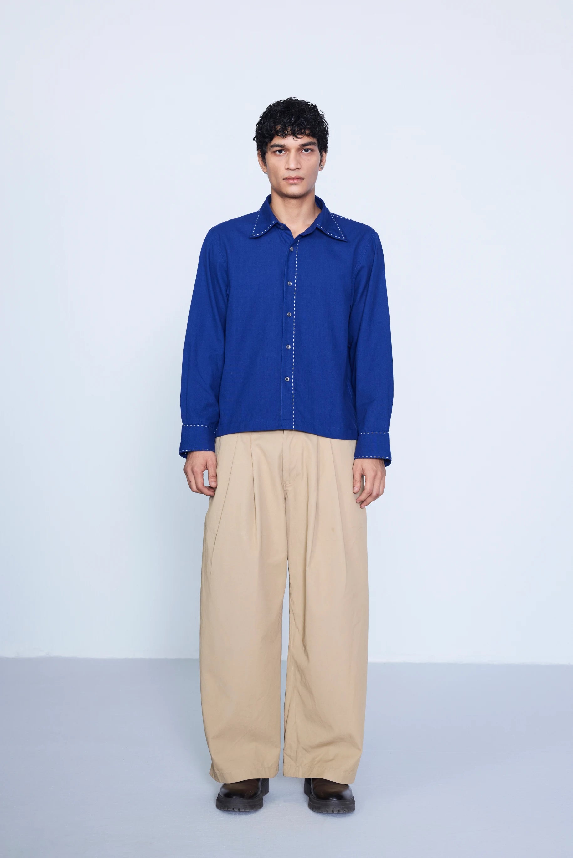 This breathable indigo handloom shirt features intricate Kantha embroidery on the cuffs, adding a subtle yet distinctive touch, perfect for everyday wear
