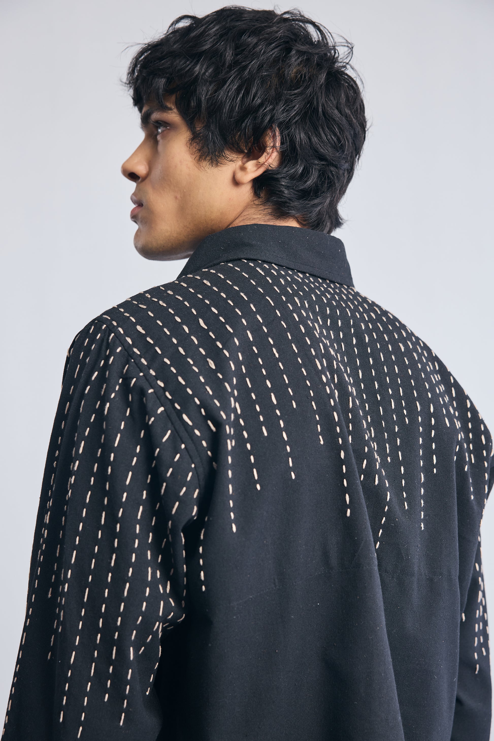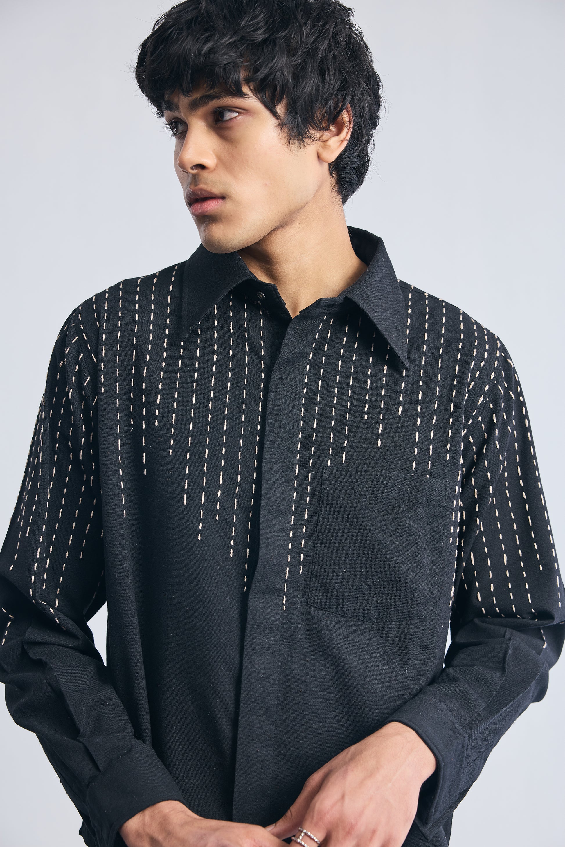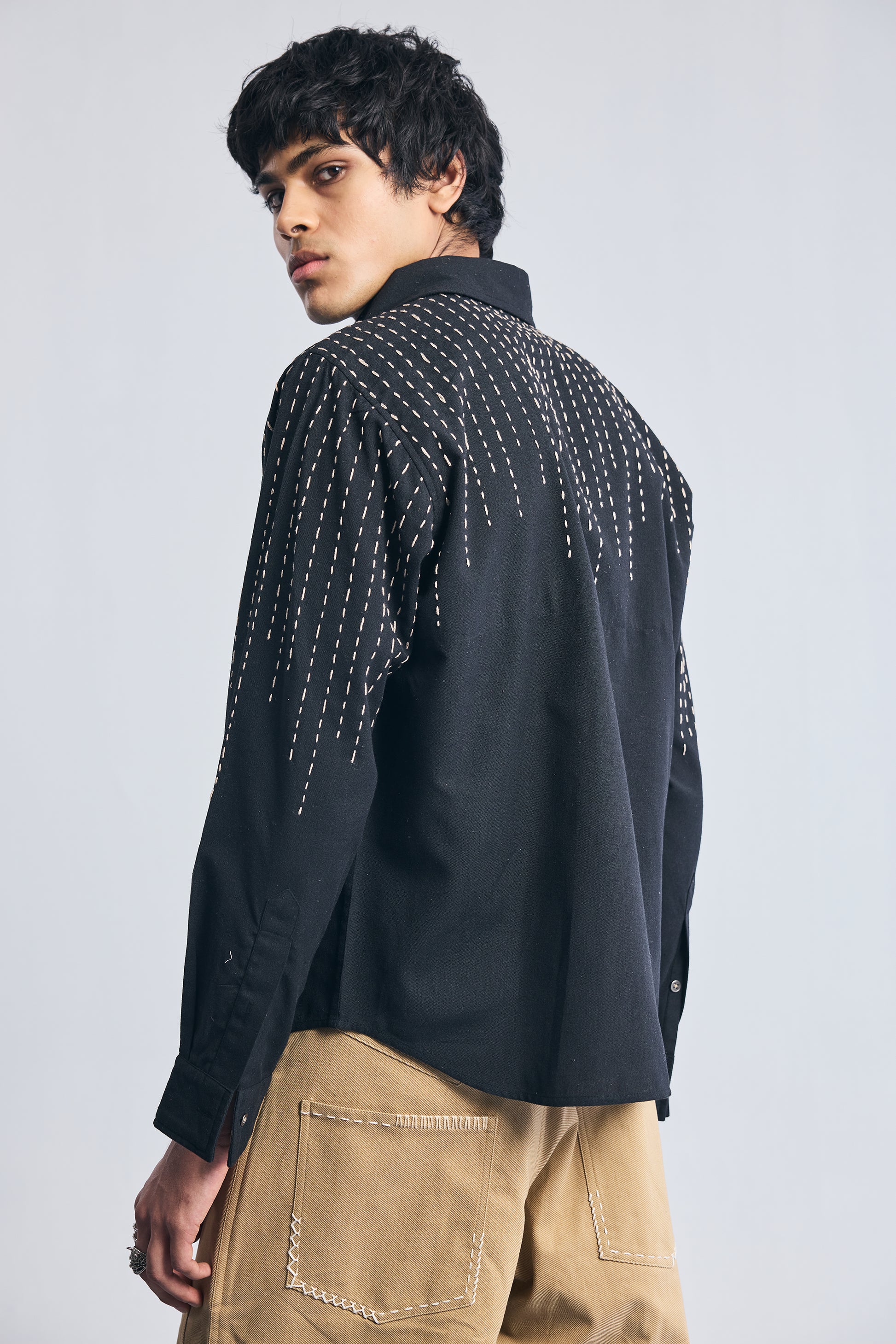 The Rainy Day Shirt captures the quiet mood of grey skies and soft drizzles. With embroidery flowing like rainfall across the chest and sleeves, each stitch reflects time, patience, and mood.