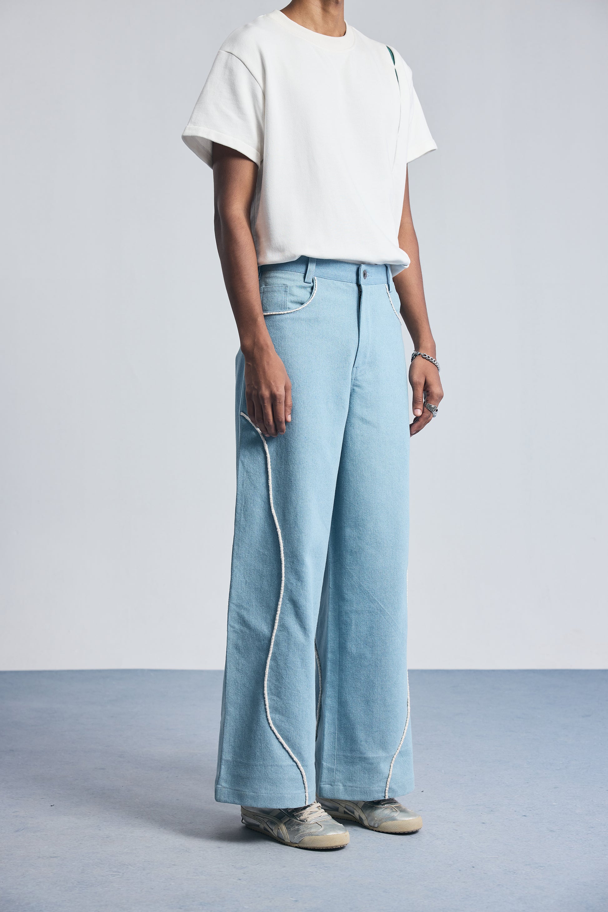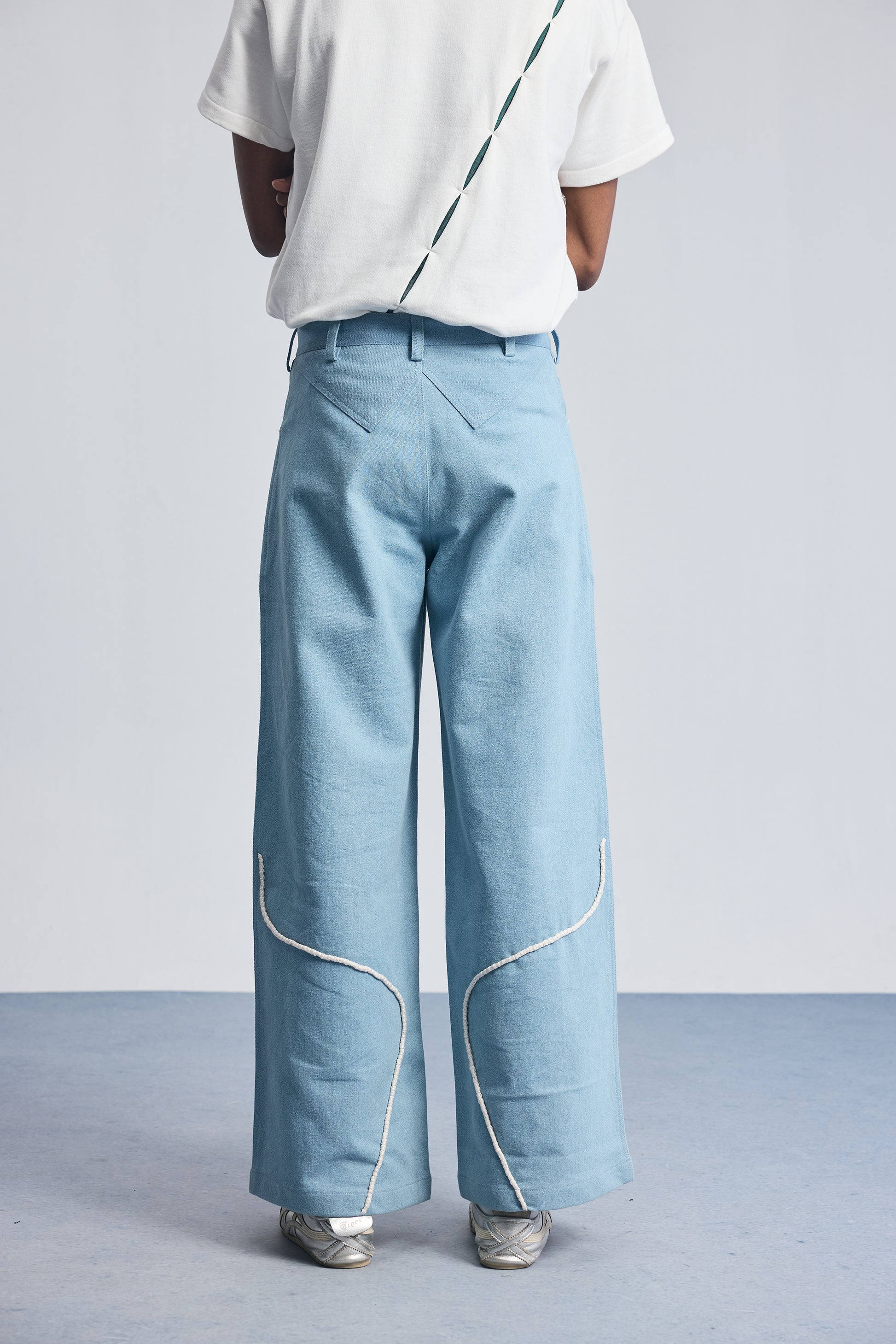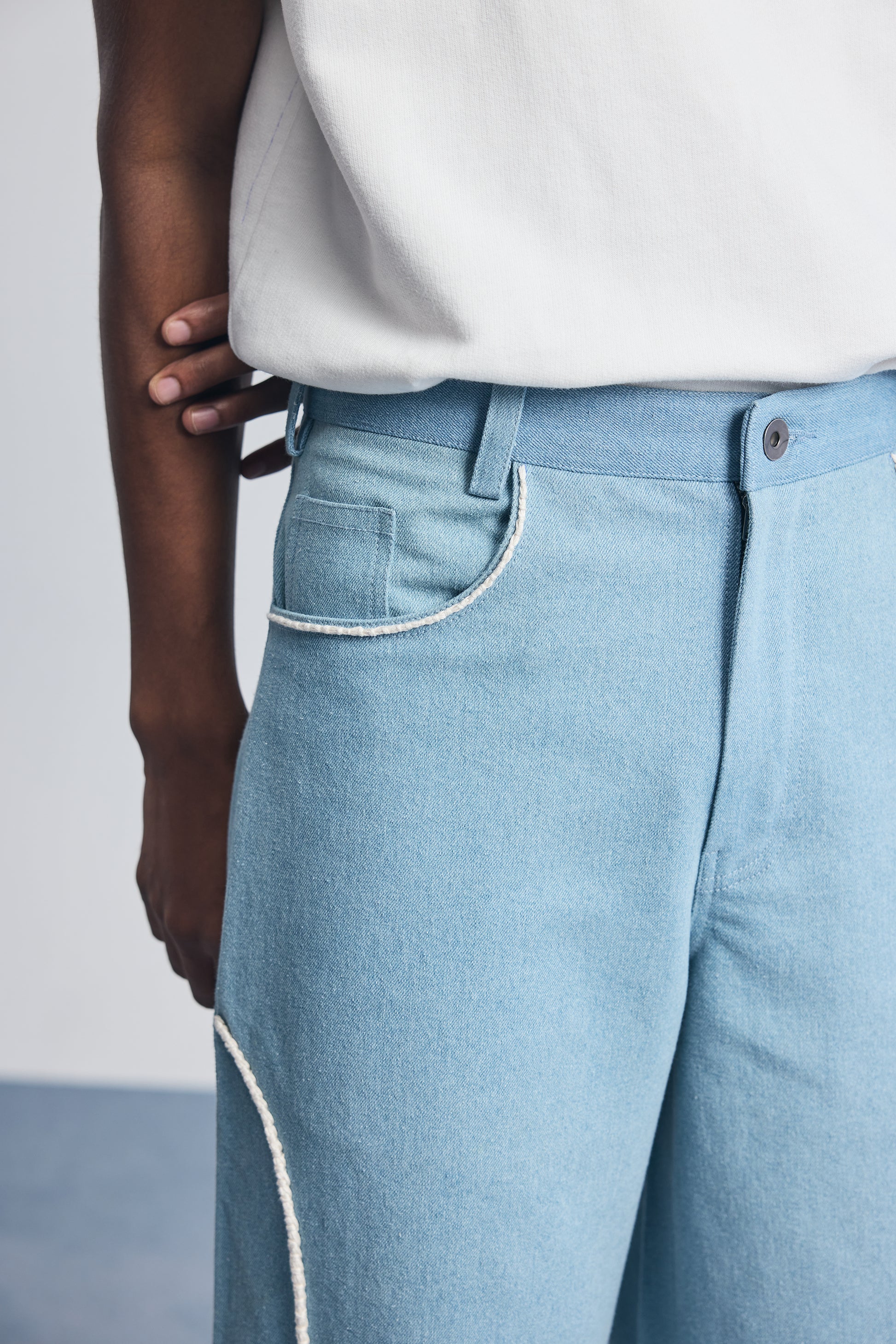These denims hold the imprint of time. Sun-aged and softened by intention, the Roped Denims are not distressed — they’re considered. A rope-like embroidery winds its way around the seams, quietly echoing movement and memory. The fit is easy, straight, and forgiving — designed not to shape the body, but to move with it. These are denims for those who walk slower, but see deeper. Meant to gather scuff, bend, sunlight — and eventually, stories.