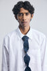 The Swirl Tie bends tradition without breaking it. The swirl tie, crafted from bonded denim and flannel, spirals down the front in a soft sculptural wave, adding movement and mood.