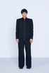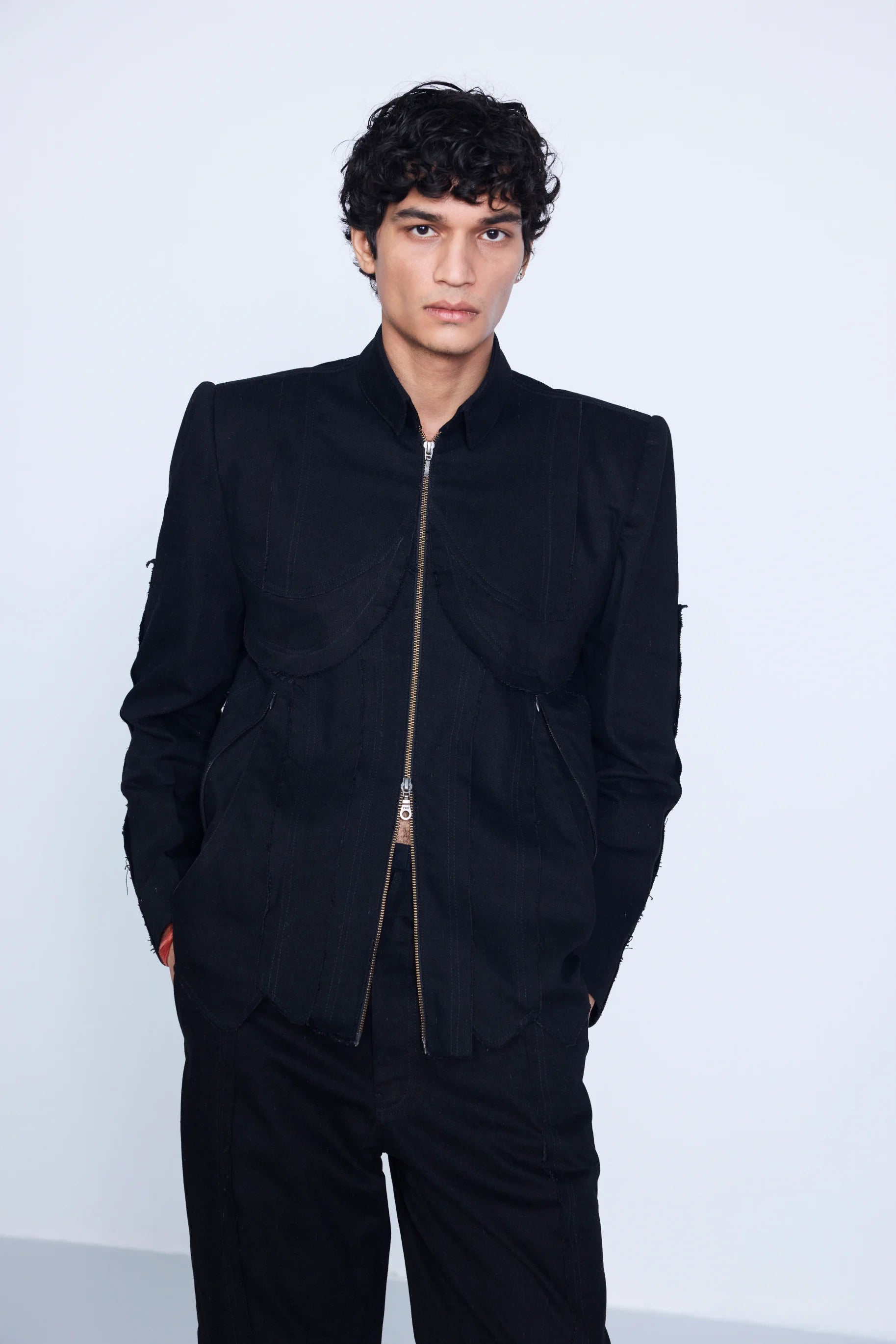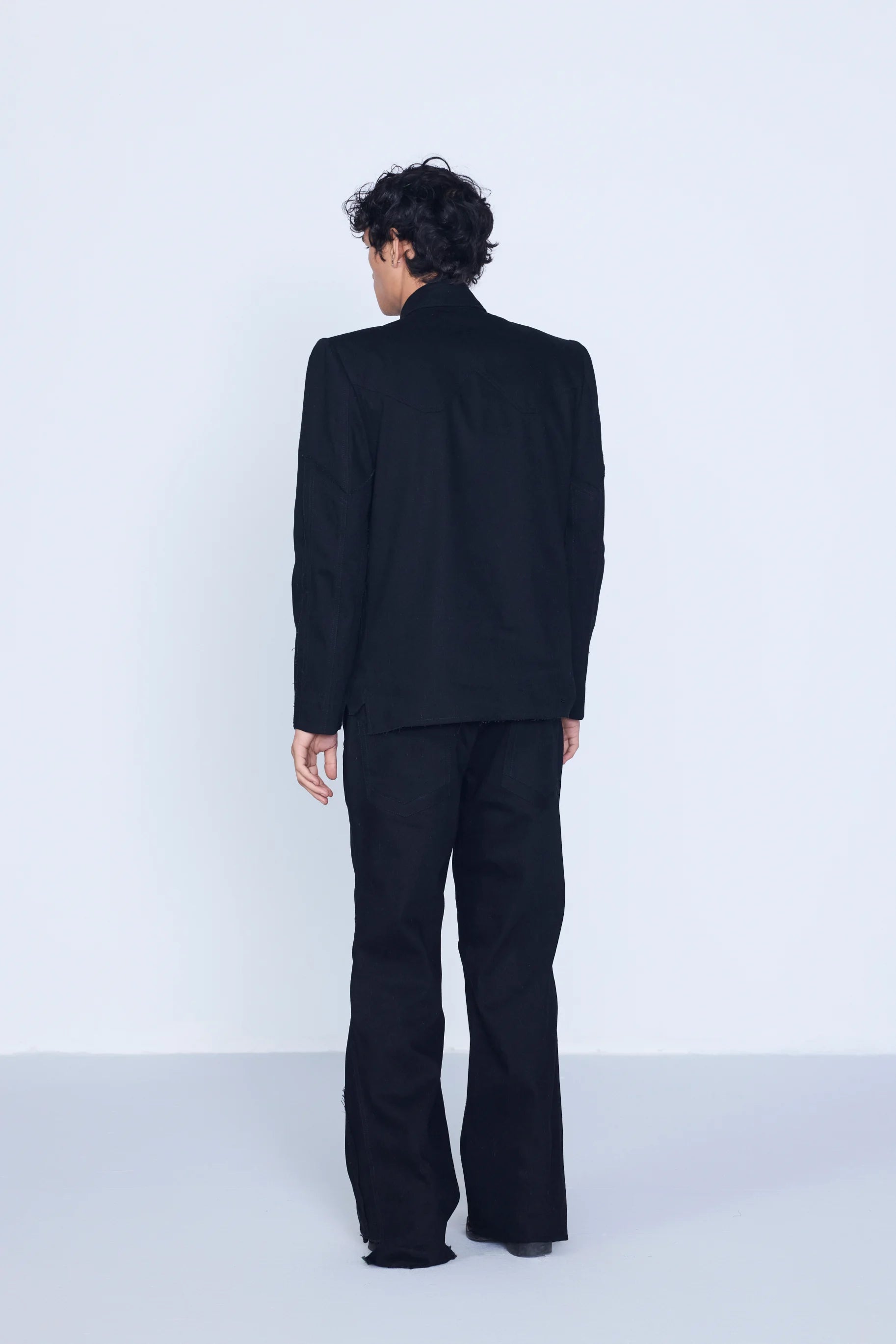 Made from selvage black denim, this jacket features side zipper details, structured shoulder padding, and dual collars. The asymmetrical hem finish adds a functional and distinctive touch to its design,